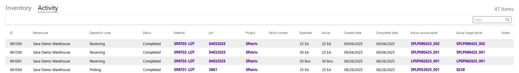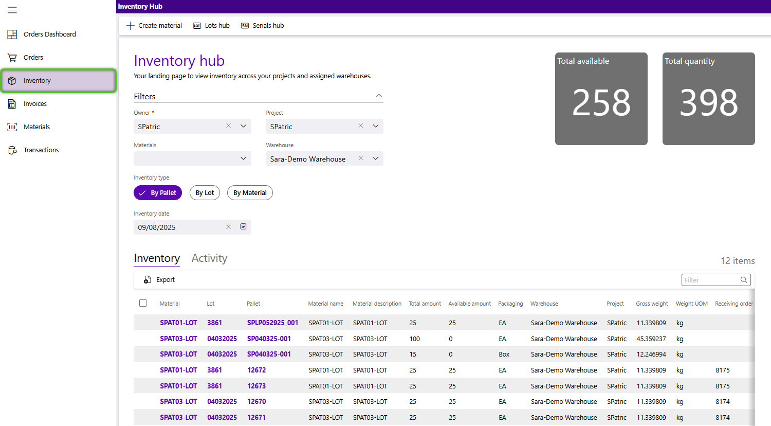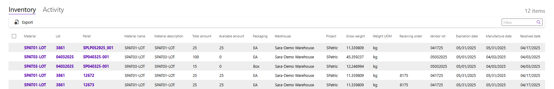 Inventory can be displayed by Pallet, by Lot, or by Material using the Inventory type buttons under the Filters dropdown.