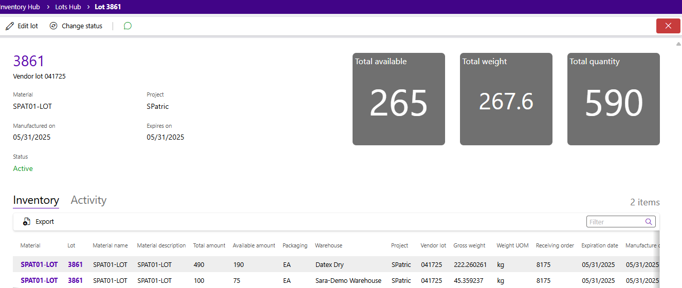 When opening individual lots, they will have their own dedicated page view for the record with a listing of all the current in warehouse inventory and the activity history for actions taken against the lot. From the record you can update the lot's status, add a discussion comment or edit some lot details such as the expiration date.