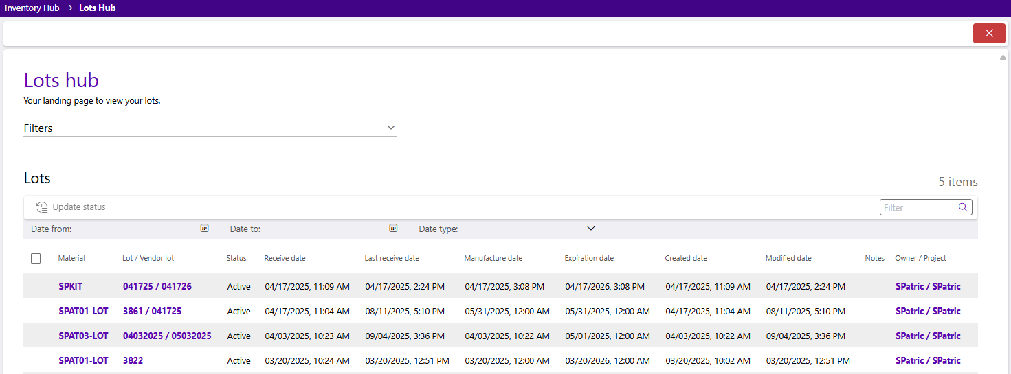 The Lots hub displays all inventory by lot that is associated with the filters set on the hub (Owner, Project, Materials and Status). When a material is lot controlled, unique lots and vendor lots will be created for inventory of that material. In addition to the filters mentioned before, lot data can also be filtered by date using the filters in the Lots grid.