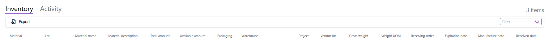 The inventory tab lists all current inventory, meaning inventory that hasn't been shipped out, for the selected lot. Displayed inventory can be searched using the filter field (if using the filter field to search either click outside the field after entering the search value or tab out of the field). Data displayed in the inventory tab gird can be exported.