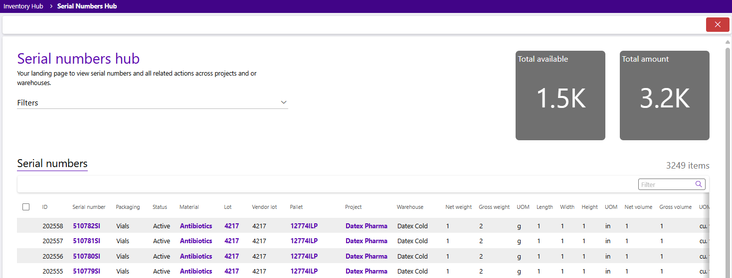 The Serial numbers hub displays inventory by serial numbers and can be filtered by Owner, Project, Materials, Warehouses, and Archived (whether or not the serialized inventory is still in the warehouse or has been shipped out) status.
