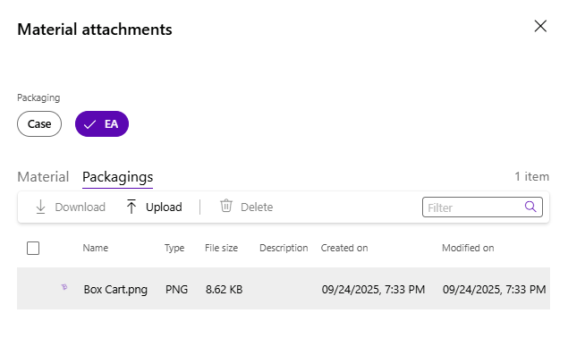Before uploading a file to the Packaging tab, first select the Packaging Type of the Material to which the new file will be added.