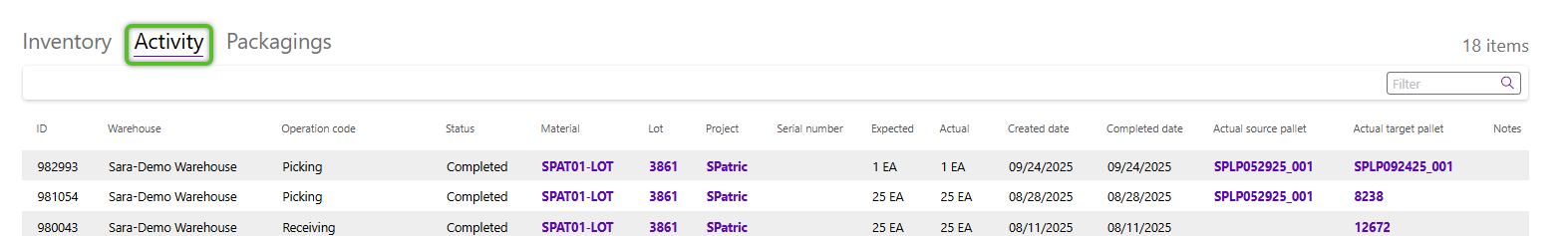 Each material record allows the user to review the material's Inventory, Activity, and Packagings. Expand the sections below for more details about each tab.
