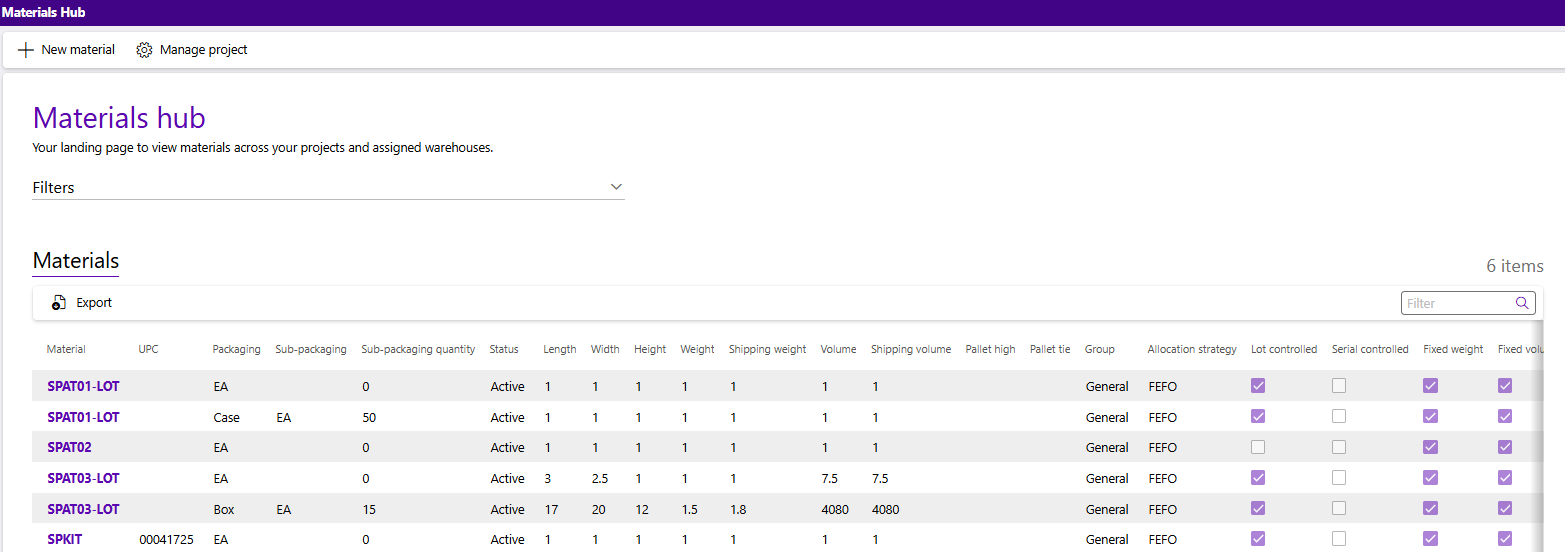Everything you store in your Warehouse, every item you ship out or receive, each piece of inventory is defined by a material. Inventory you work with requires a material in the system to represent it, and the information about those items can be managed in the Materials hub. Materials can be created, edited, and reviewed from the hub. Options in material configuration include different ways to group together like materials for storage and billing purposes as well as defining packaging levels.