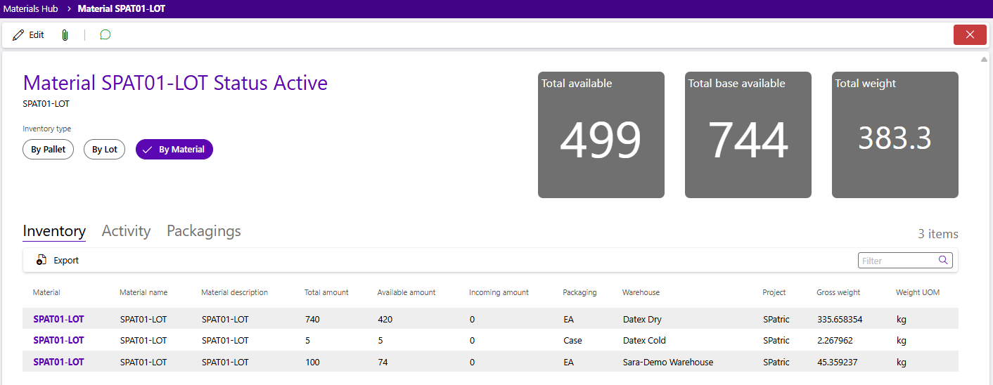 The material record can be opened for further review and management by clicking the material name hyperlink. The material's basic information will be displayed, including the name, status, and description. The default inventory view is "By Material. Users can also view the material's Inventory "By Pallet" or "By Lot".