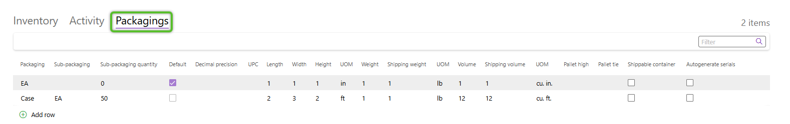 If more levels of packaging are needed, add a new row, and then in the Sub-packaging field, select the packaging that would go inside the new packaging. In the Sub-packaging quantity field, enter the amount of smaller packages that fit inside the new packaging level. Continue this way for as many levels as are needed.