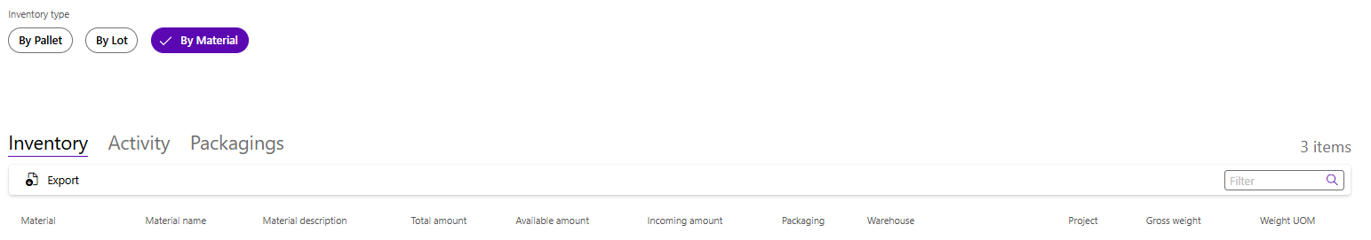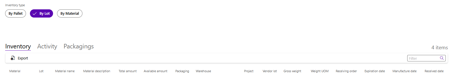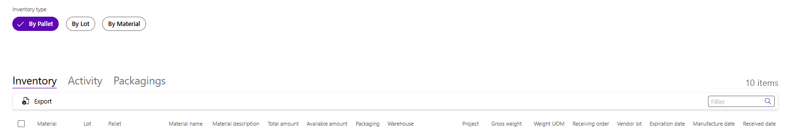 The Inventory tab is grouped "By Material" by default. Material inventory can also be grouped "By Pallet" and "By Lot". The information displayed in the Inventory tab will change depending upon the selected grouping.