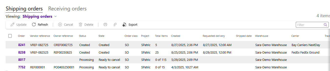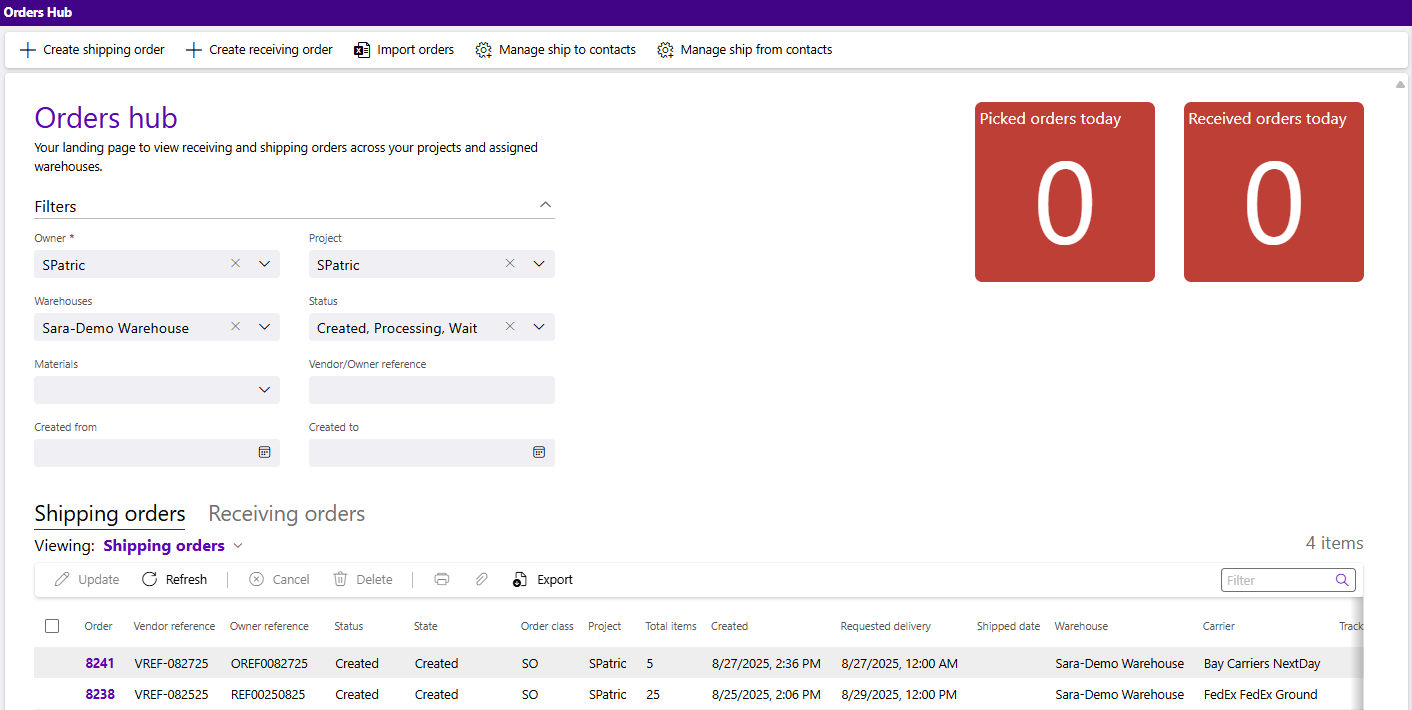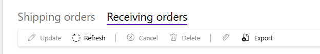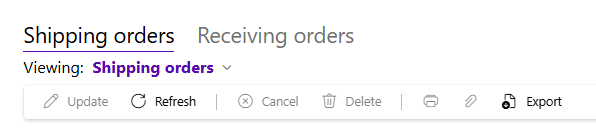 The order tabs are divided between Shipping orders and Receiving orders. Each tab on the Order Hub displays its own set of information and options for managing related data. Expand the sections below for more details about each tab.