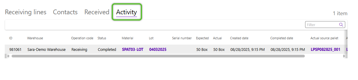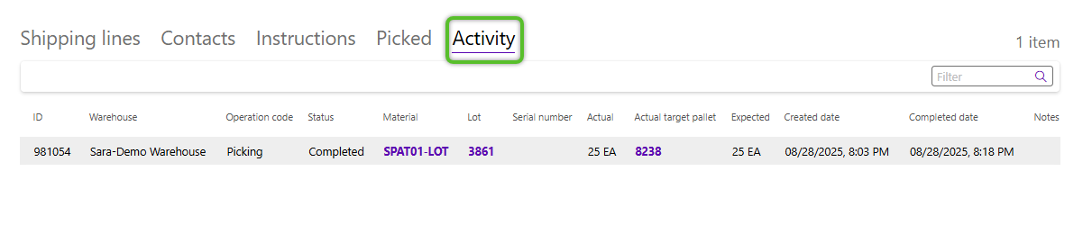 The Activity tab displays the order's task history in the warehouse, including details such as material, user, completed date and more.