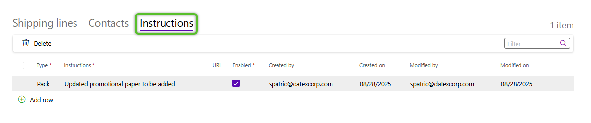 The Instructions tab displays the order's Instructions for the warehouse regarding certain parts of the process, along with options to Add and Delete Instructions.