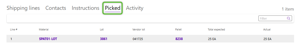 The Picked tab displays information on completed pick tasks for the shipping order.