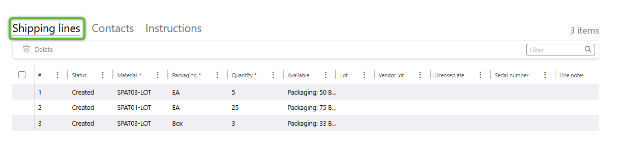 The Shipping lines tab displays the associated order lines, along with options to Add and Delete lines depending on the state of the order.