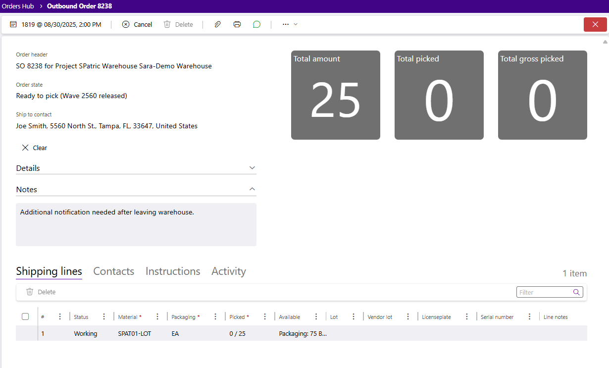 The shipping order's basic information will be displayed, including the Order number, Order Class, Project, Warehouse, Order Status, and Order State. The Details section can be opened for more information about the Order.