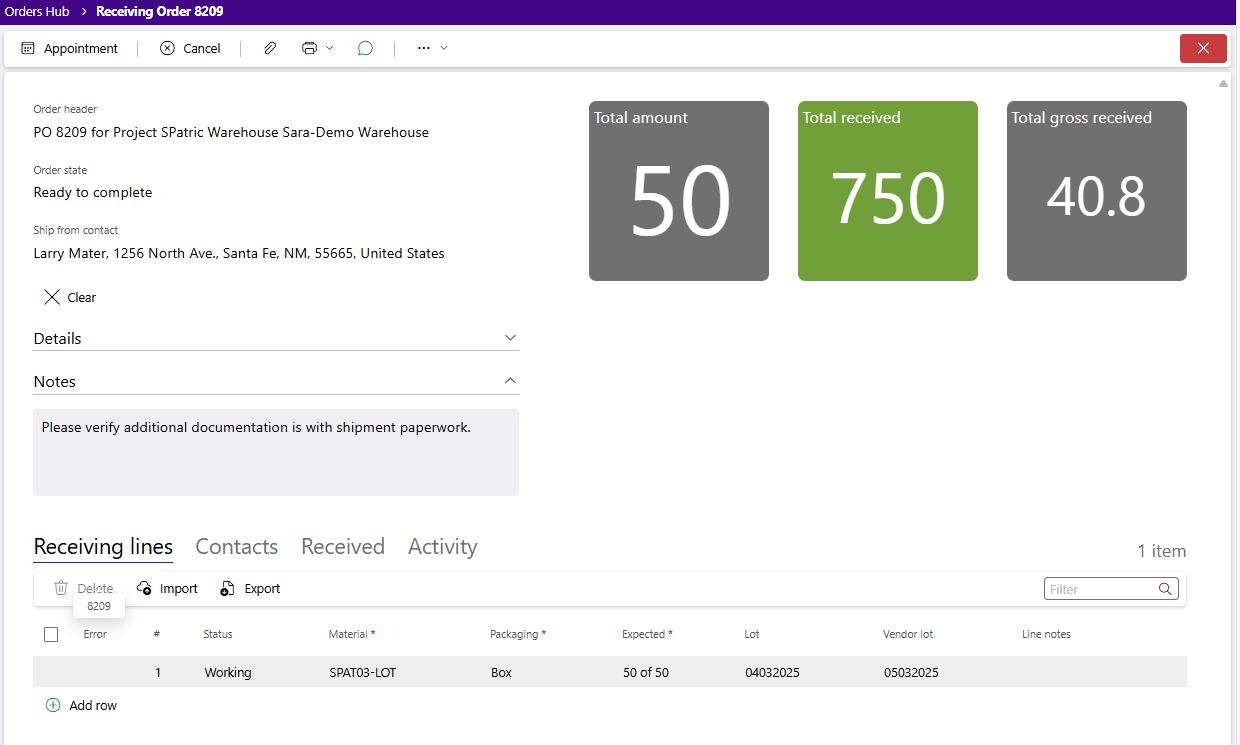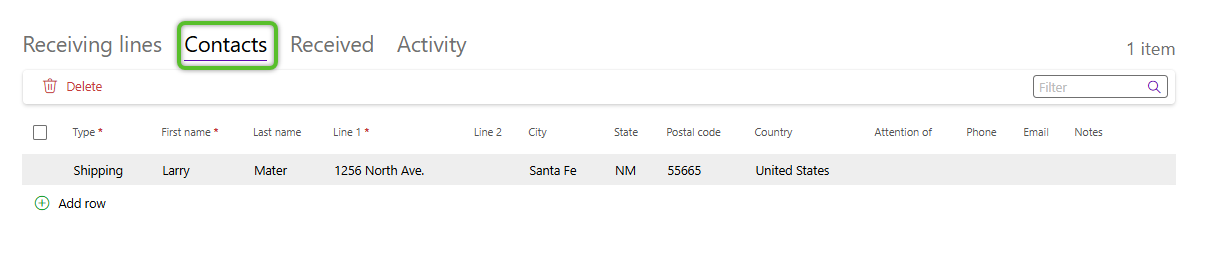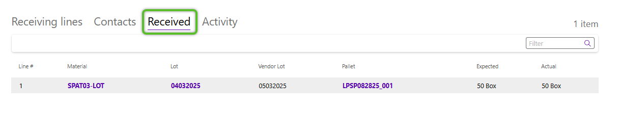 The receiving order's Receiving lines, Contacts, Received, and Activity are listed in the tabs along the bottom. Each tab on the receiving order displays its own set of information and options for managing that information. Expand the sections below for more details about each tab.