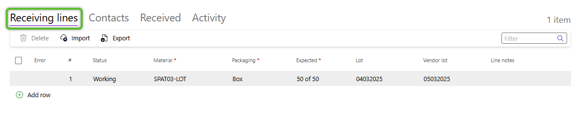 The Receiving lines tab displays the order's order lines, along with options to Add and Delete lines depending on the state of the order.