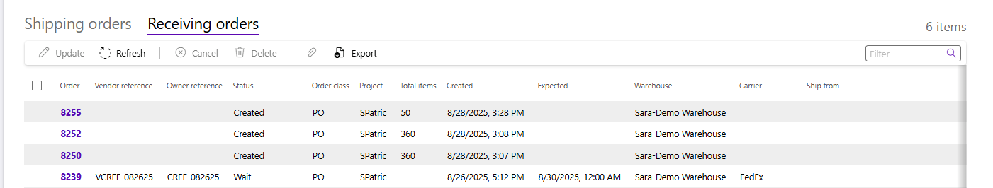 The Receiving orders tab lists all inbound orders, with the most recent at the top.