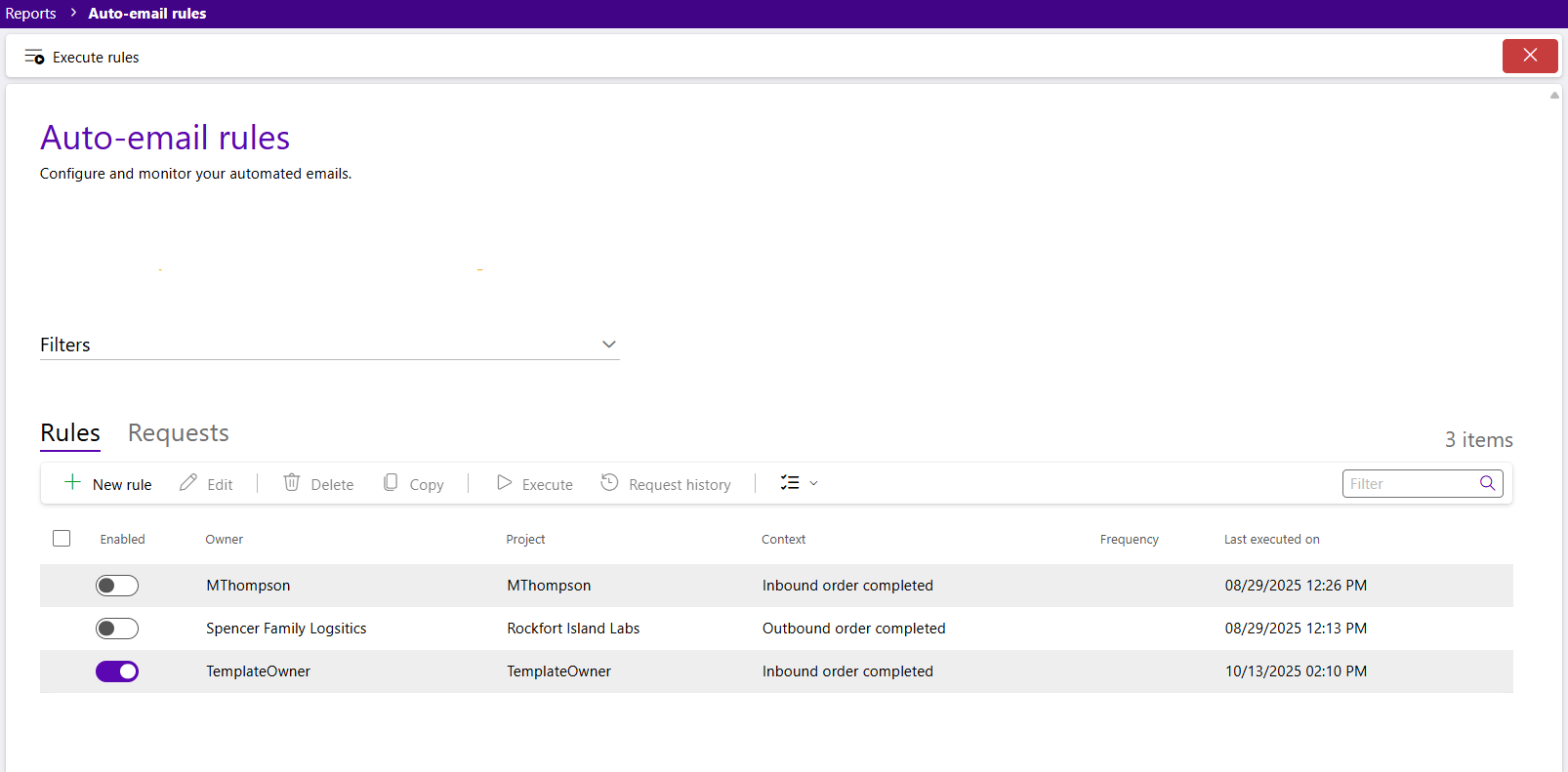 While auto-email rules can be set up and managed at the project level, and the request history at the order level, the Auto-email rules hub provides a single view of both, along with some additional management options.