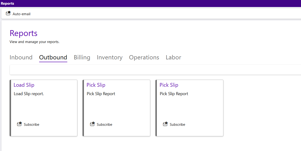 Available reports are divided between six different tabs, Inbound, Outbound, Billing, Inventory, Operations, and Labor. Please note what reports are available to you will vary.