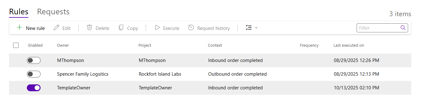 Rules can be filtered by Owner, Project, and Context (rule trigger, for example outbound order completion).
