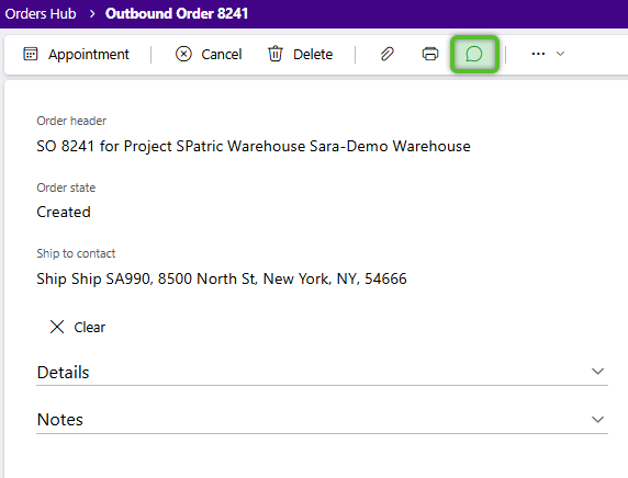 1. In the order, invoice, or other entity, locate the Discussion button - it looks like a speech bubble and in some places may be under the additional options dropdown (...) menu.