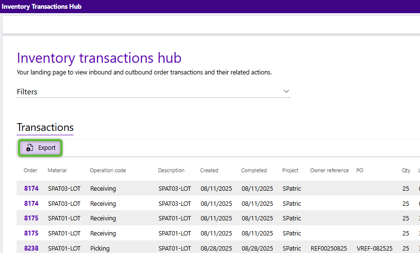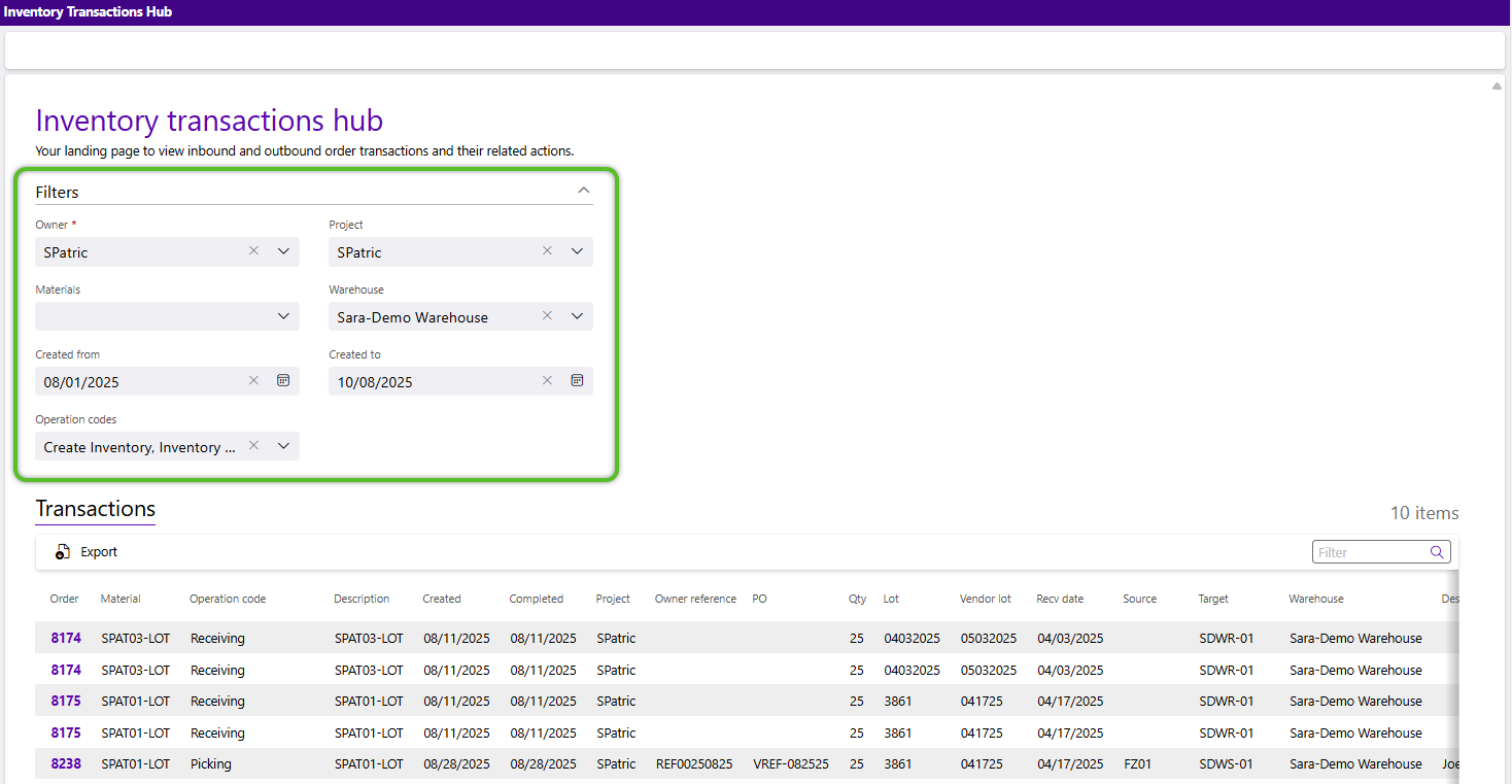 1. To configure the data in the grid to your liking, regardless of the hub, click the down arrow to the right of the Filters header to open the section and review the parameters. As you make selections the data in the grid will update to reflect your choices. Additional filter options may be available in the grid depending on the hub.