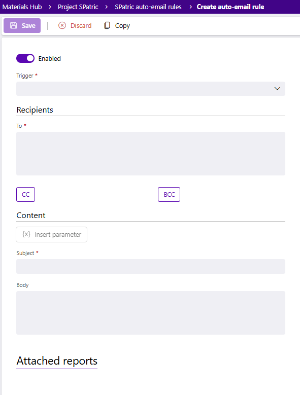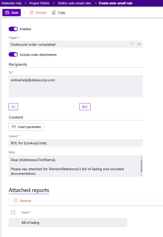 7. In the Content section, a Subject much be provided for the email. The Body for the email is optional. For either field parameters may be added using the Insert parameters button. These are fields that can be added that will utilize data the associated entity. For example, the Lookup parameter for an Order trigger will use that Order's lookup code.