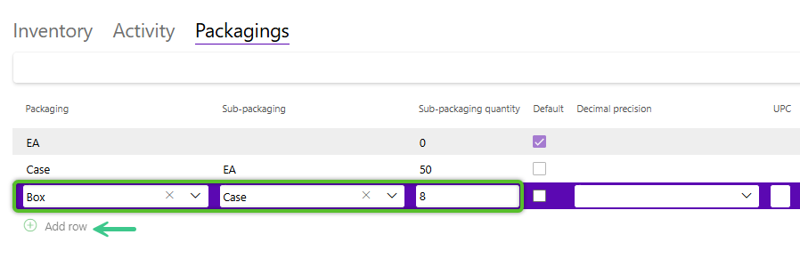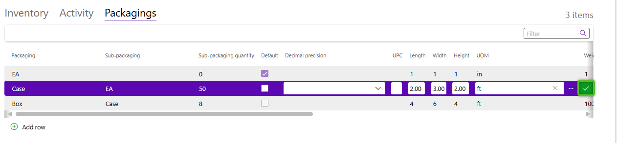 2. Click on the row for the packaging you wish to edit. The row will become editable and you can make your changes with the exception of the Packaging, Sub-packaging, and Sub-packaging quantity fields.