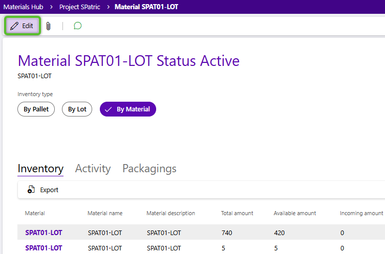If you possess the needed permissions for Footprint Portal, you can make some limited edits to an existing material. Certain options, such as whether or not it was lot controlled or fixed weight, can't be changed if there is any inventory for the material in or coming into the warehouse. Packaging levels can also be added to a material record if there are multiple, and their dimensions updated.