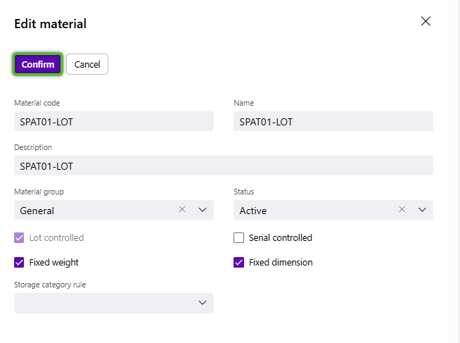 2. Edits can be made to most of the fields with the exception of the Lot controlled, Serial controlled, Fixed weight, and Fixed dimension. If there is inventory for the material in the warehouse or expecting in the warehouse on an incoming receiving order these fields cannot be updated until there is no inventory. If changes have to be made you may need to work with the warehouse to perform an inventory transformation on the existing inventory.