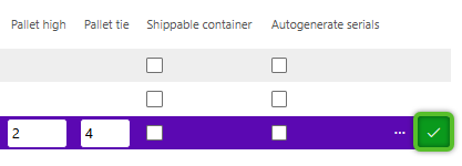 7. (Optional): Enter a Pallet high (how high this material packaging level can be stacked) and Pallet tie (how many packages of this level can fit on a pallet before stacking).