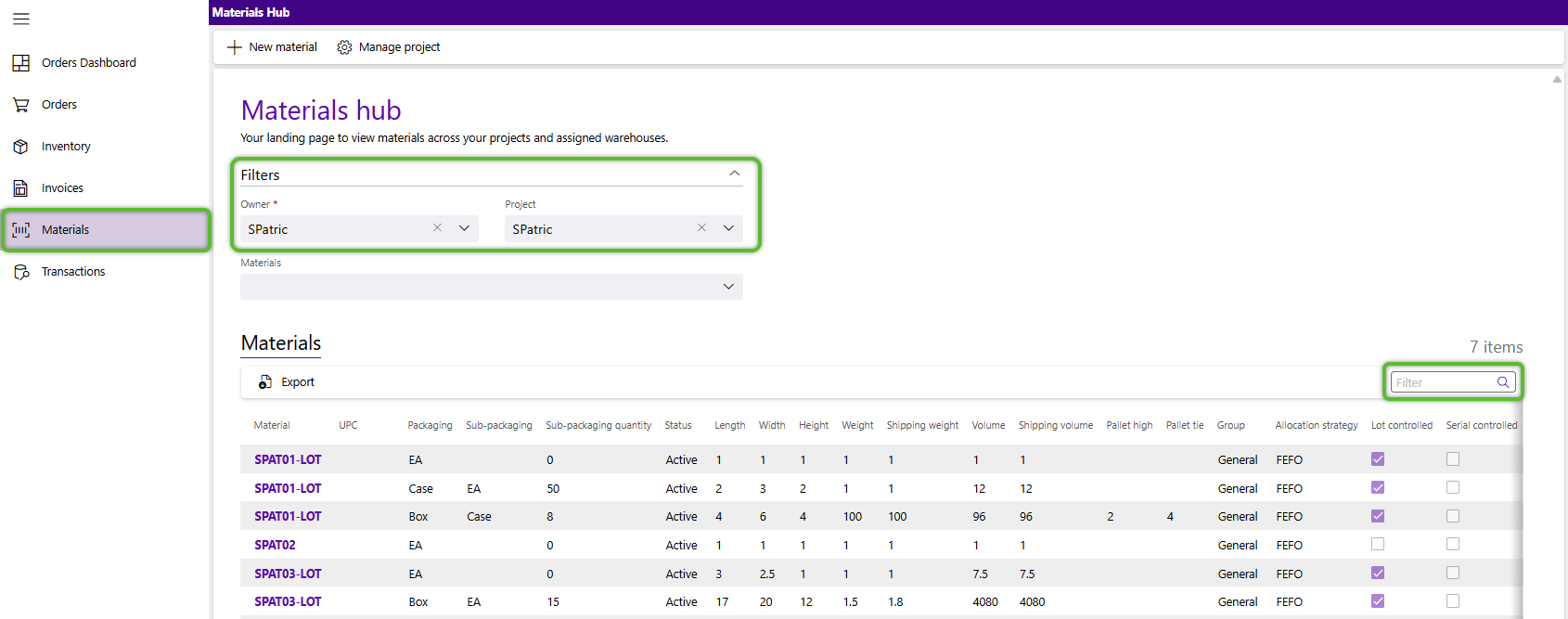 Option A, Step 2. If you have access to more than one owner and/or project, ensure the Owner and Project set are the combination the material is assigned to. If not you may need to clear the fields and set to the required owner and project.