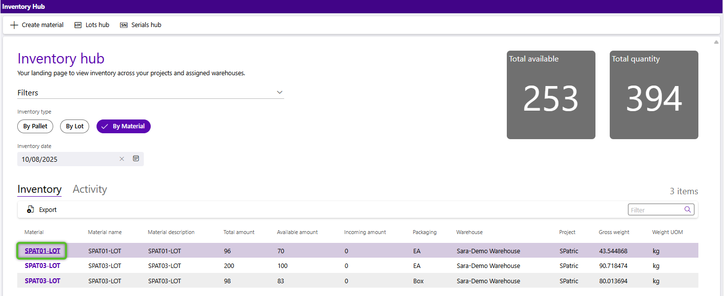 Option B: Click on the material's lookup code in any grid where it appears as a hyperlink. This isn't just limited to the Materials hub. You may find such hyperlinks in orders and the Inventory hub.