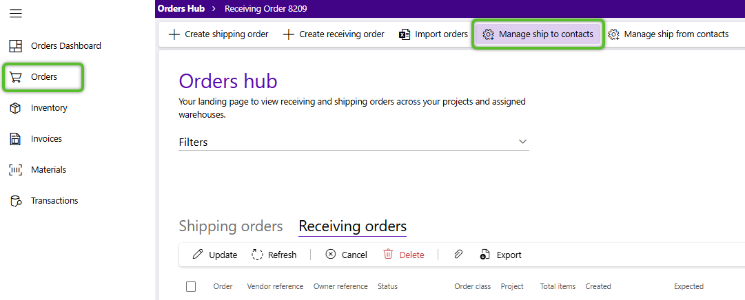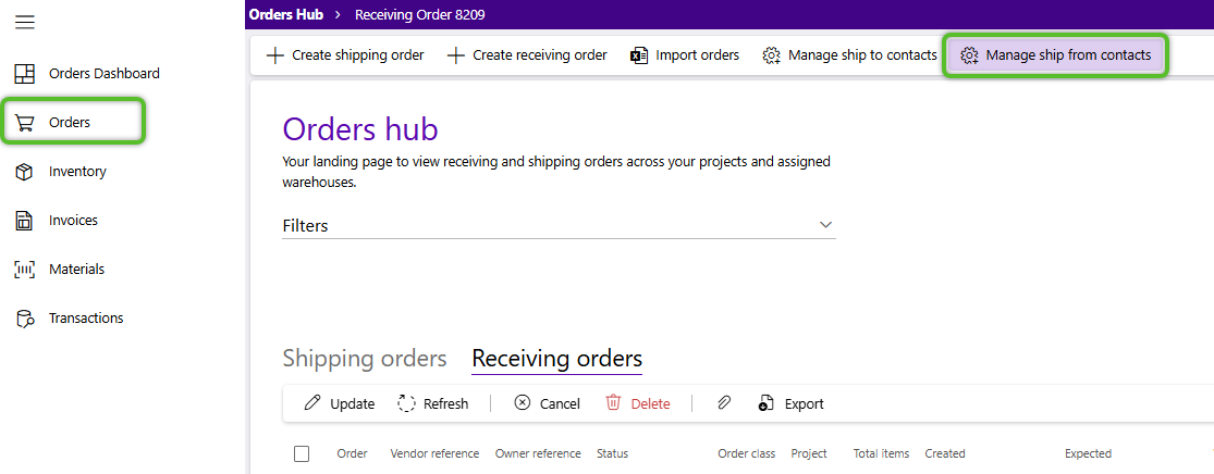 1. On the Orders hub, under the Filters section, set the Owner and Project for the new contact to be assigned - this may be populated by default.
