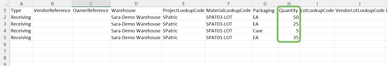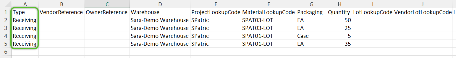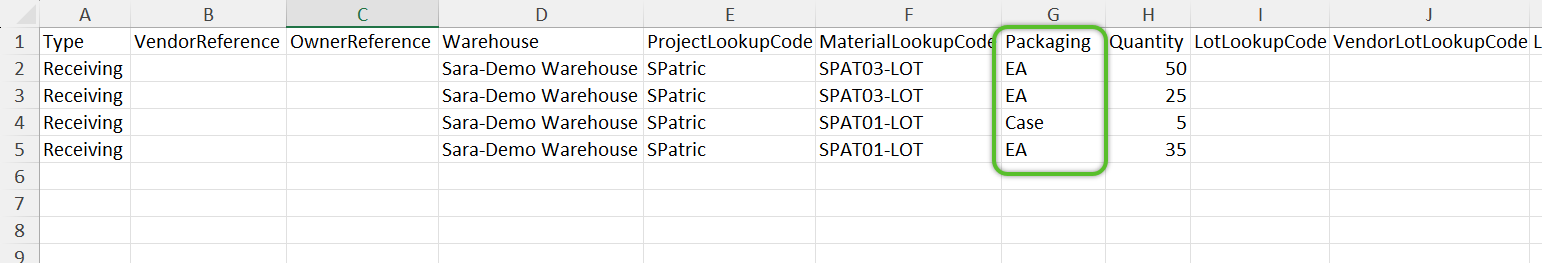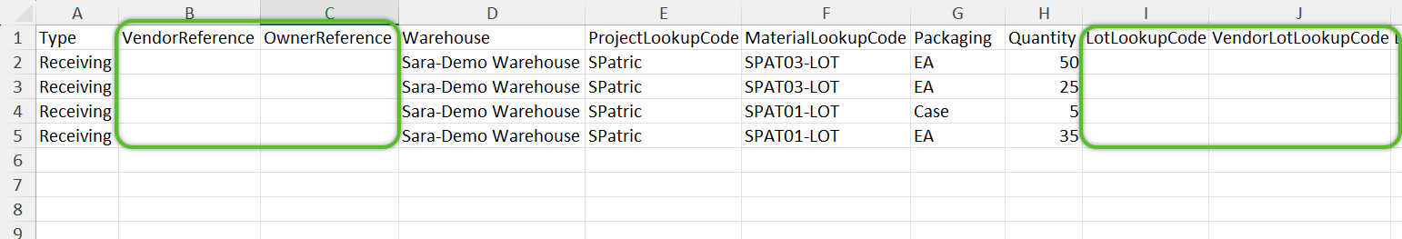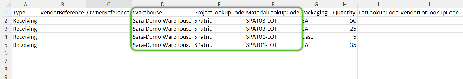 5. Do not change the values populated in columns D, and E, indicating the Warehouse and ProjectLookupCode. Only copy them to additional rows as needed. Input MaterialLookupCode(s) in column F. This is the lookup code for the item being either received or shipped out. Only one should be input per row.