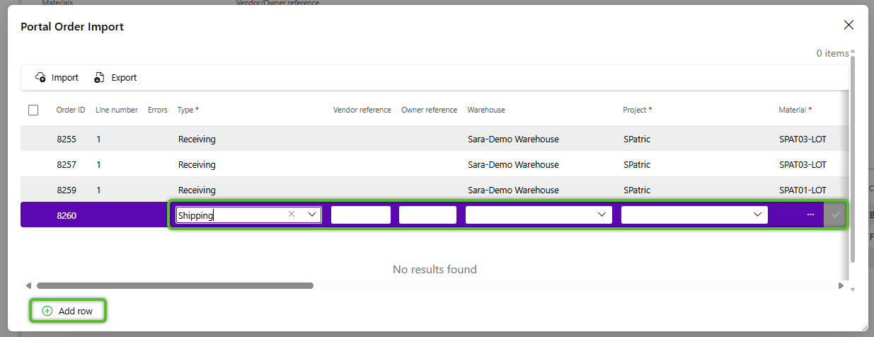 When adding data to the import file, all capitalization, spelling, and spacing-- including spaces at the beginning or end that may not be easily seen, must match exactly with the Warehouse, ProjectLookupCode, and MaterialLookupCode values as they appear in the application or an error will occur when importing.