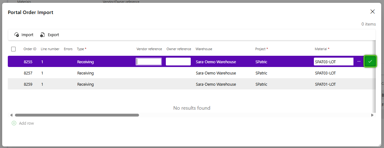 Click into a row to make changes to an order, then click the green checkmark on the right to update the order details.
